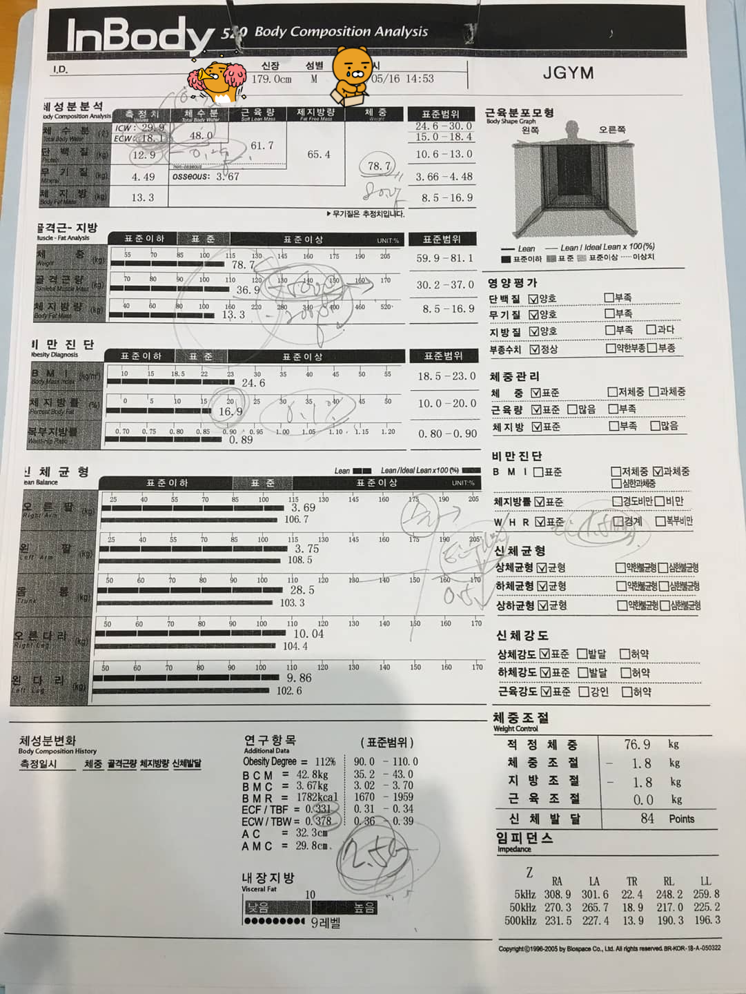 | 신체균형 (㎏) | 오른팔 : 3.76 왼팔 : 3.76 몸통 : 28.7 오른다리 : 10.19 왼다리 : 10.01 |