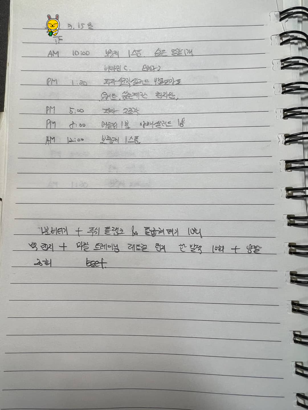 오전 10시 : 단백질 보충제 1 스쿱, 삶은 계란 1, 비타민 1알, 오메가 3 1알
