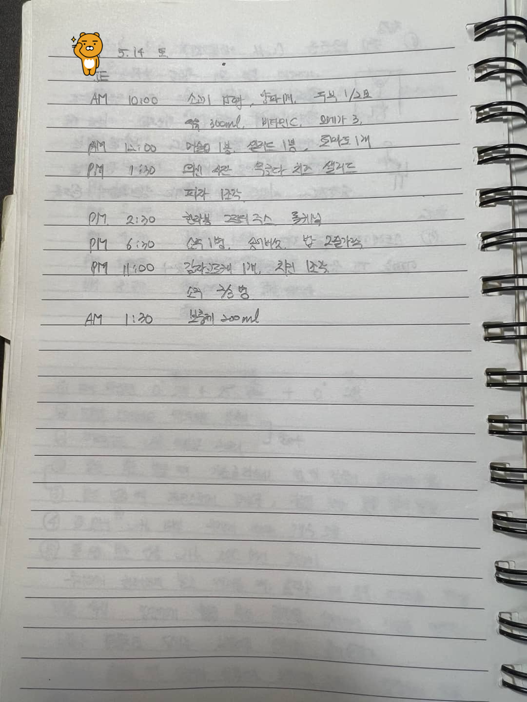 오전 10시 : 소고기 150g, 양파 1개, 두부 반모, 우유 한잔, 비타민 1알, 오메가 3 1알