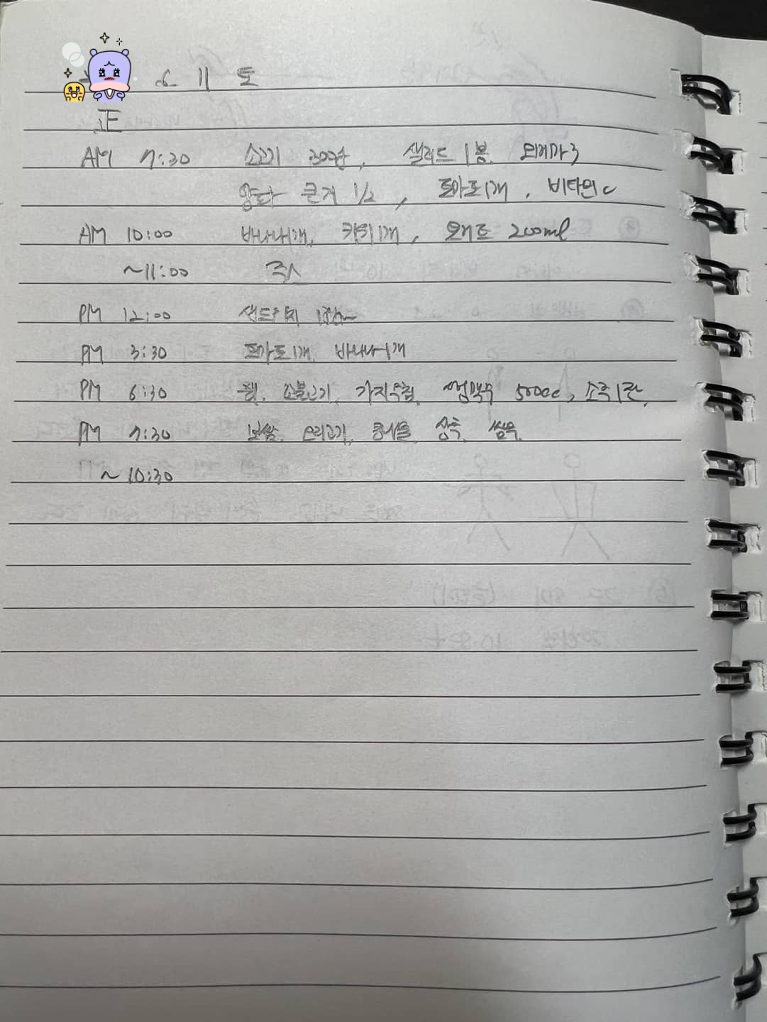 오전 7시 30분 : 소고기 300g, 샐러드 1 봉지, 오메가 3 1알, 양파 반 개, 토마토 1개, 비타민 1알
