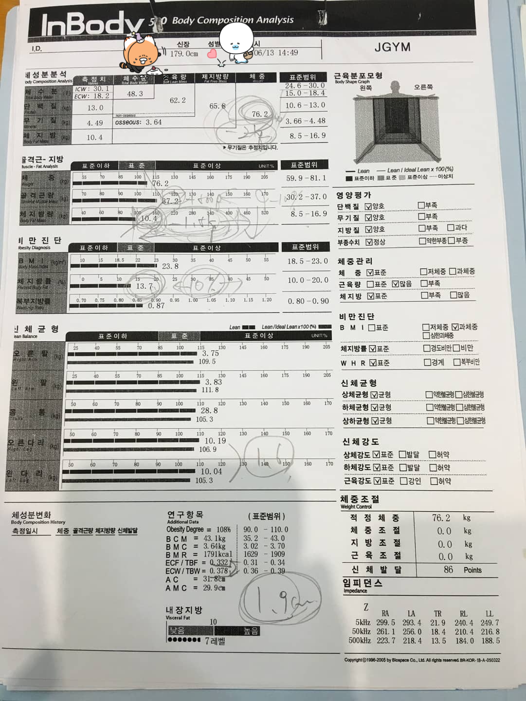 | 신체균형 (㎏) | 오른팔 : 3.7 왼팔 : 3.78 몸통 : 28.5 오른다리 : 10.07 왼다리 : 9.89 | 오른팔 : 3.75 왼팔 : 3.83 몸통 : 28.8 오른다리 : 10.19 왼다리 : 10.04 |