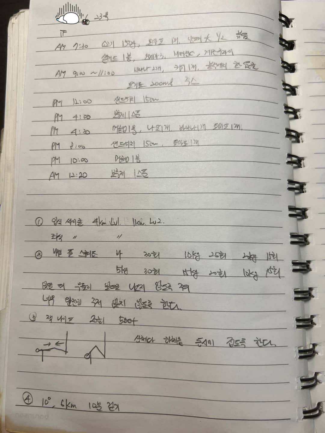 오전 7시 30분 : 소고기 150g, 토마토 1개, 양파 반 개, 샐러드 1 봉지, 오메가 3 1알, 비타민 1알, 계란프라이