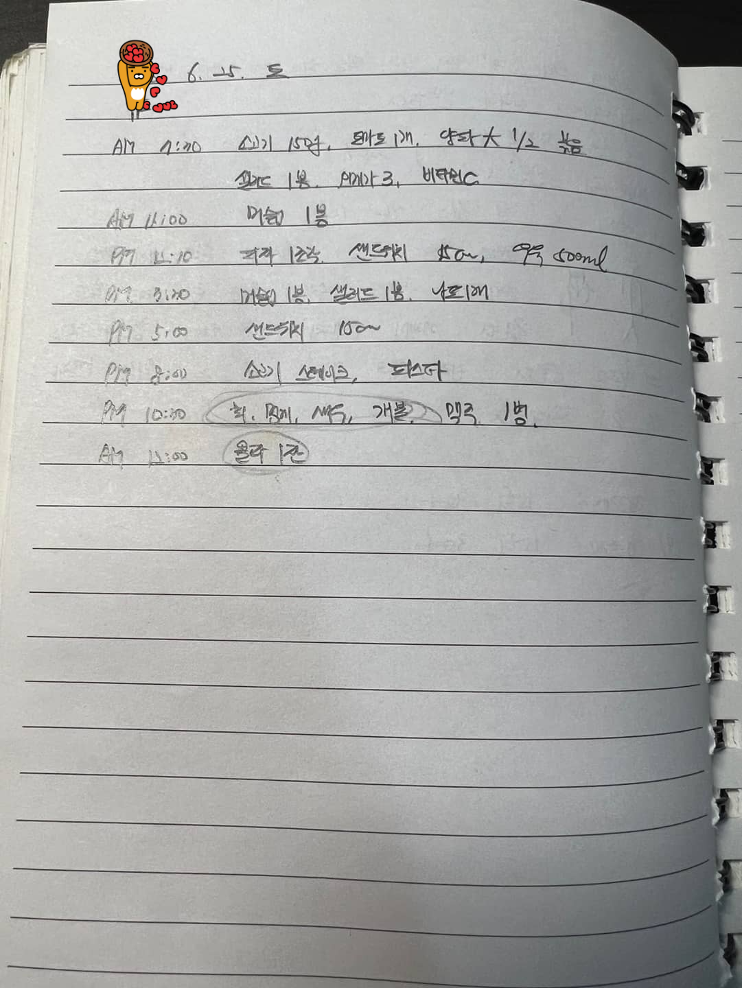 오후 12시 : 서브웨이 샌드위치 15㎝, 우유 500㎖
