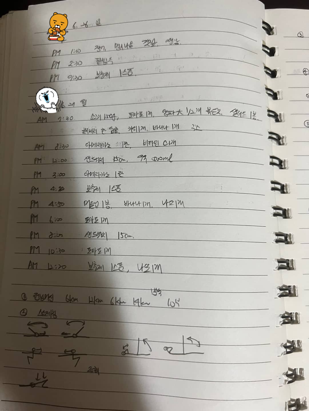 오전 7시 30분 : 소고기 150g, 토마토 1개, 양파 반 개, 샐러드 1 봉지, 블루베리 한 움큼, 키위 1개, 바나나 1개