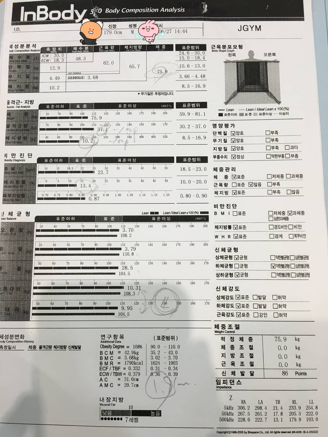 | 신체균형 (㎏) | 오른팔 : 3.71 왼팔 : 3.77 몸통 : 28.4 오른다리 : 10.47 왼다리 : 10.18 |