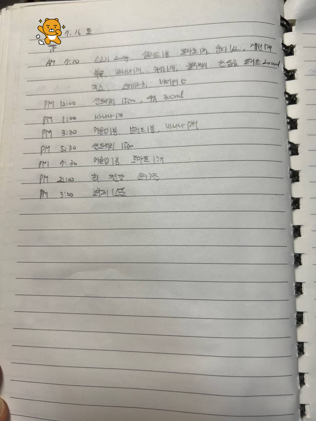 오전 7시 10분 : 소고기 200g, 샐러드 1 봉지, 토마토 1개, 양파 반 개, 계란 1개, 바나나 1개, 키위 1개, 블루베리 한 움큼, 450㎖ 요구르트 반 통, 오메가 3 1알, 비타민 1알