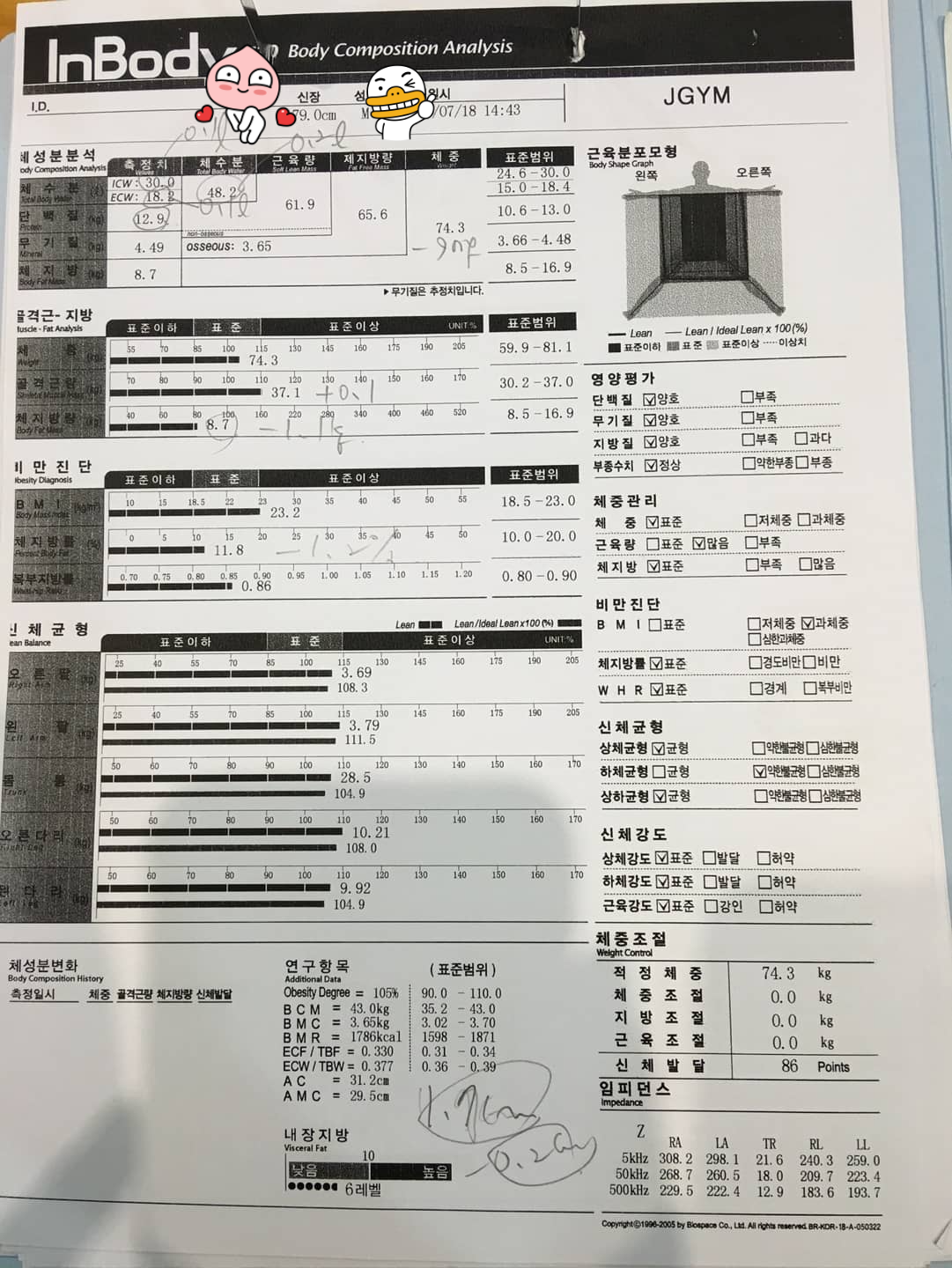 | 신체균형 (㎏) | 오른팔 : 3.65 왼팔 : 3.69 몸통 : 28.1 오른다리 : 10.25 왼다리 : 9.97 |