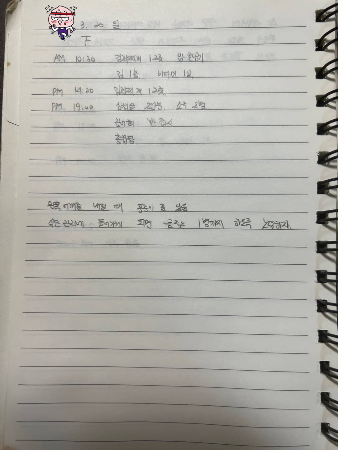 오후 3시 : 김치찌개, 밥 한 공기, 김, 비타민 1알