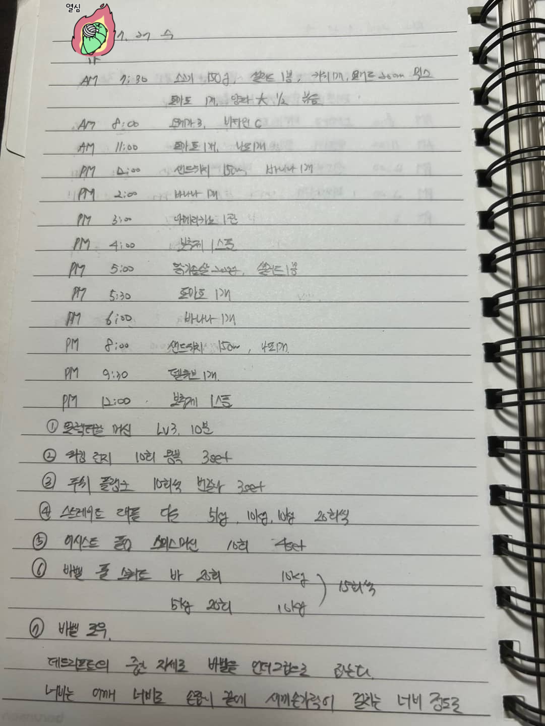 바 20회, 5㎏ 20회, 10㎏ 15회