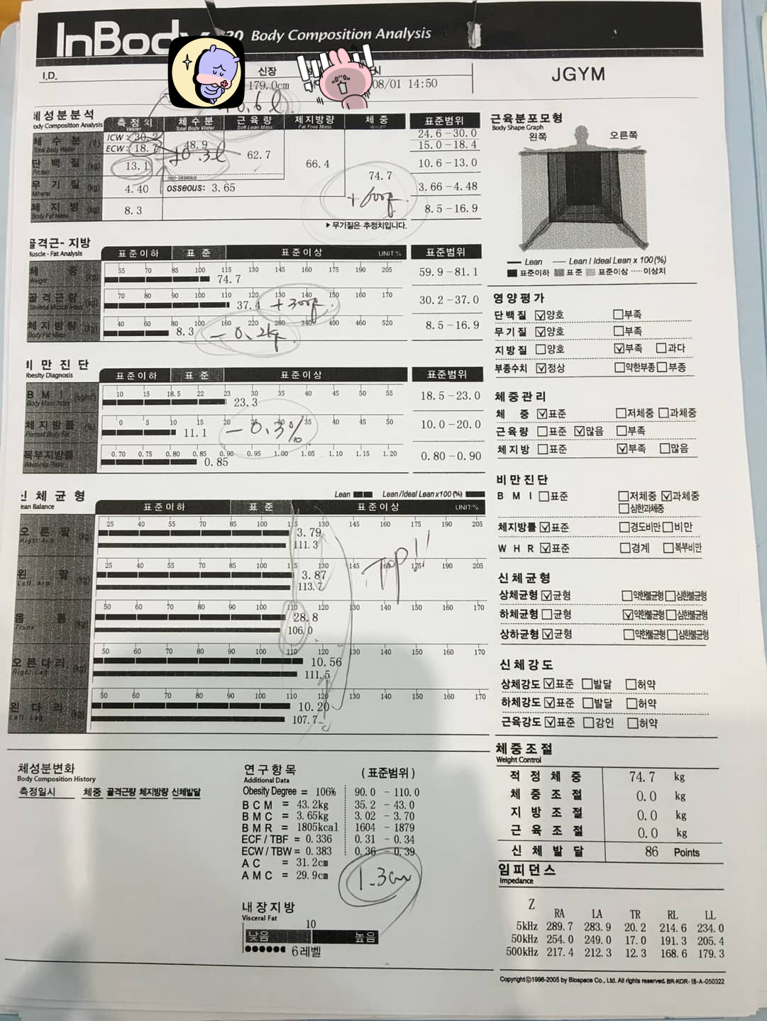| 신체균형 (㎏) | 오른팔 : 3.74 왼팔 : 3.78 몸통 : 28.5 오른다리 : 10.35 왼다리 : 10.04 |