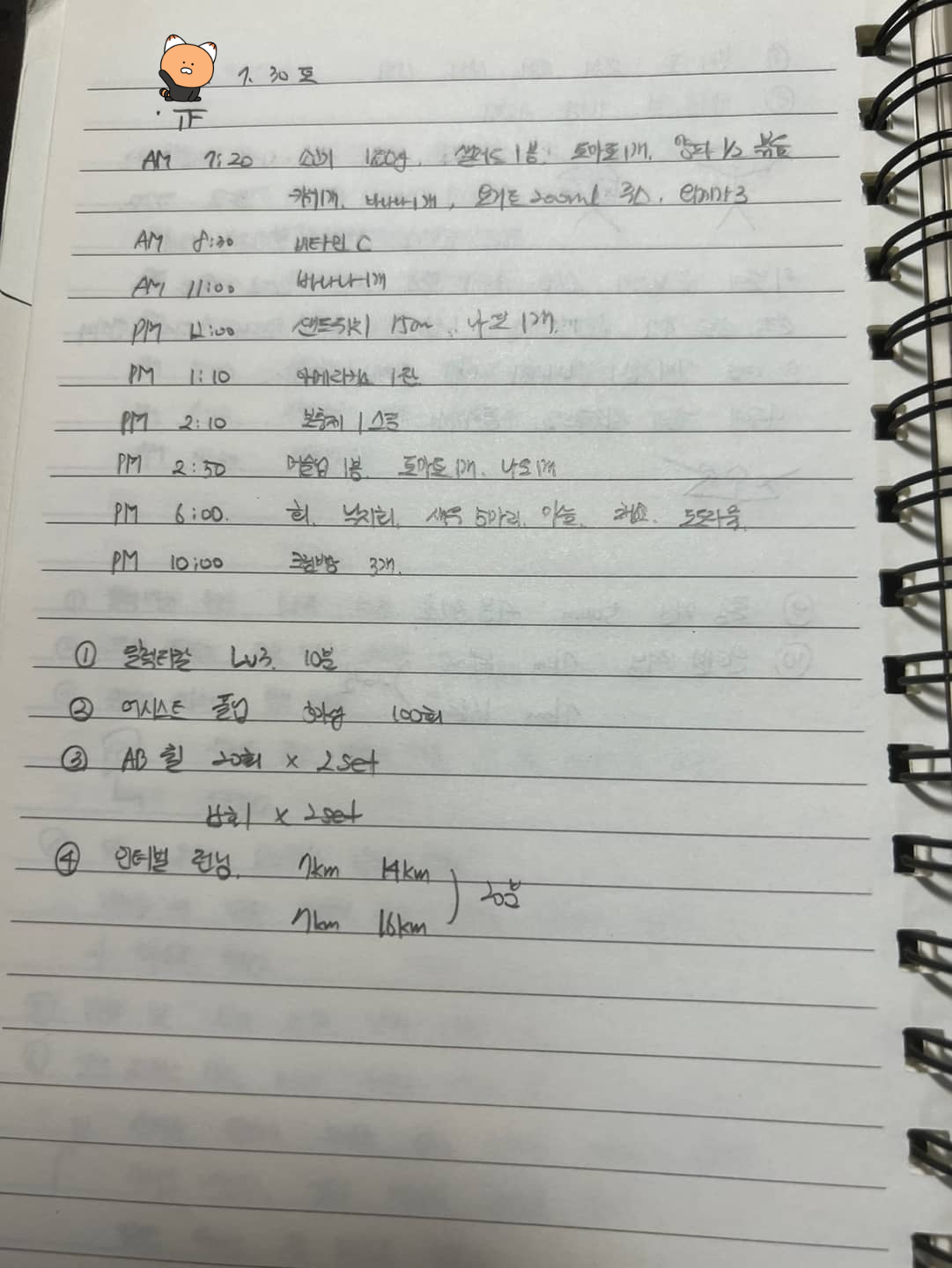 오전 7시 20분 : 소고기 150g, 샐러드 1 봉지, 토마토 1개, 양파 반 개, 키위 1개, 바나나 1개, 450㎖ 요구르트 반 통, 오메가 3 1알