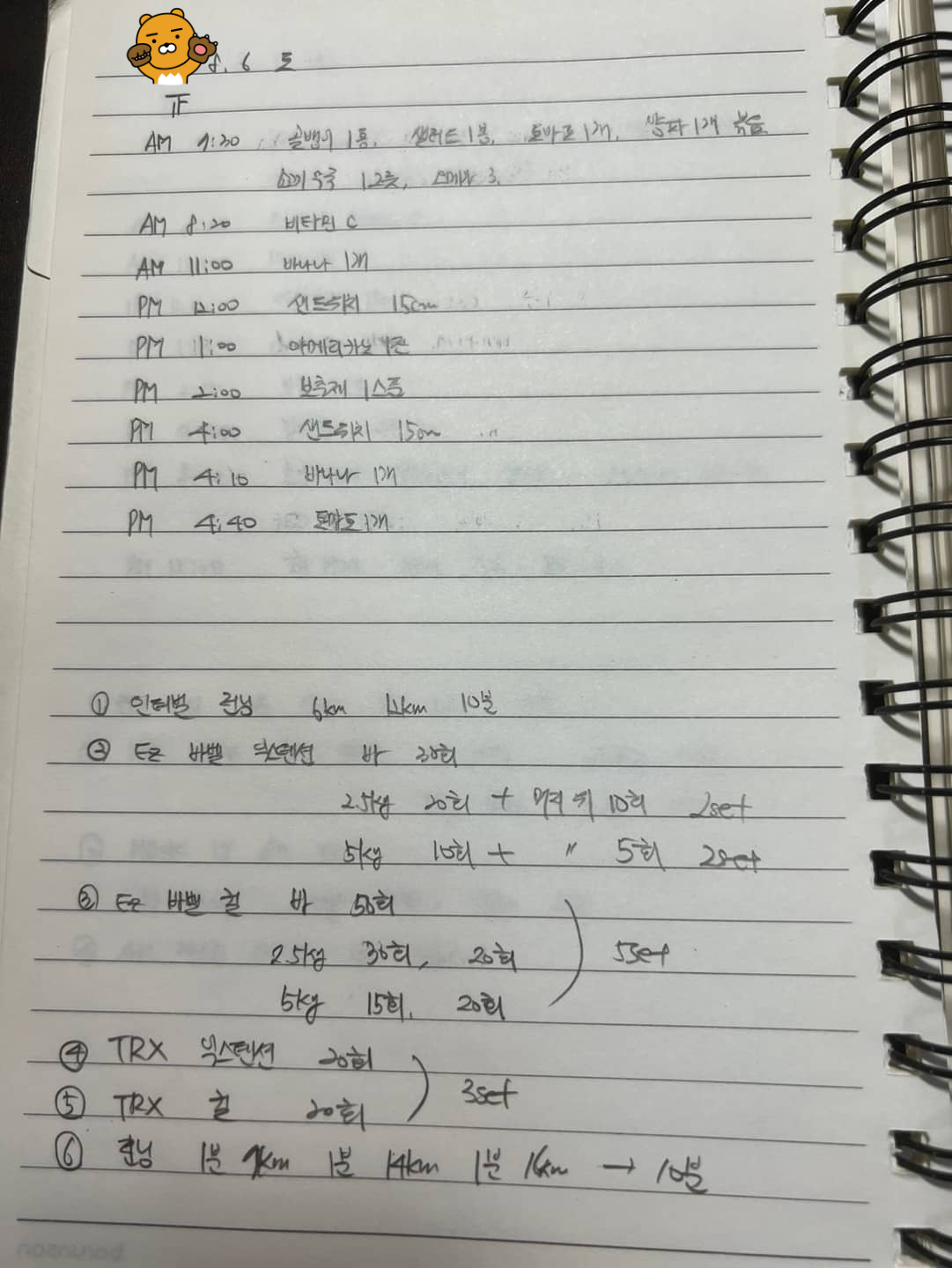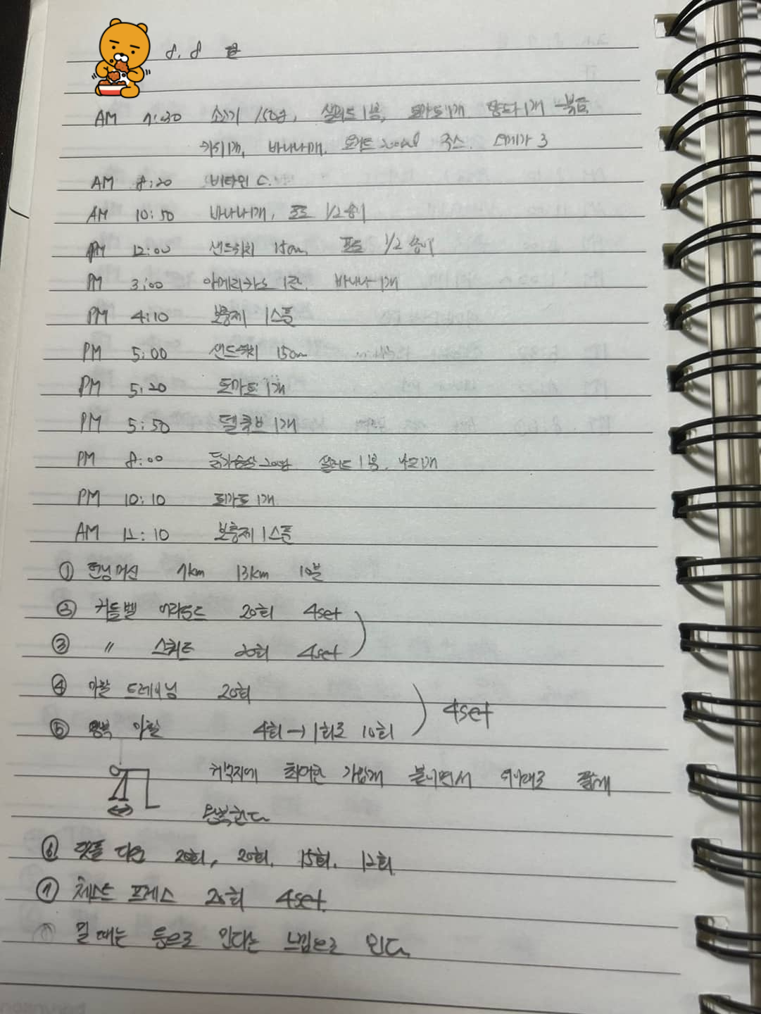 바 50회, 2.5㎏ 30회, 20회 2세트, 5㎏ 15회, 20회 2세트