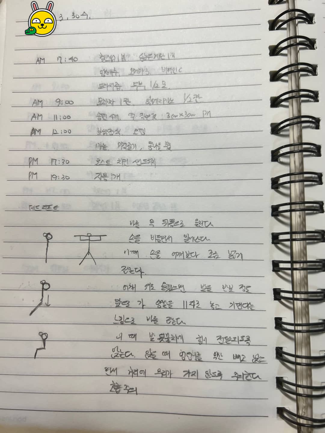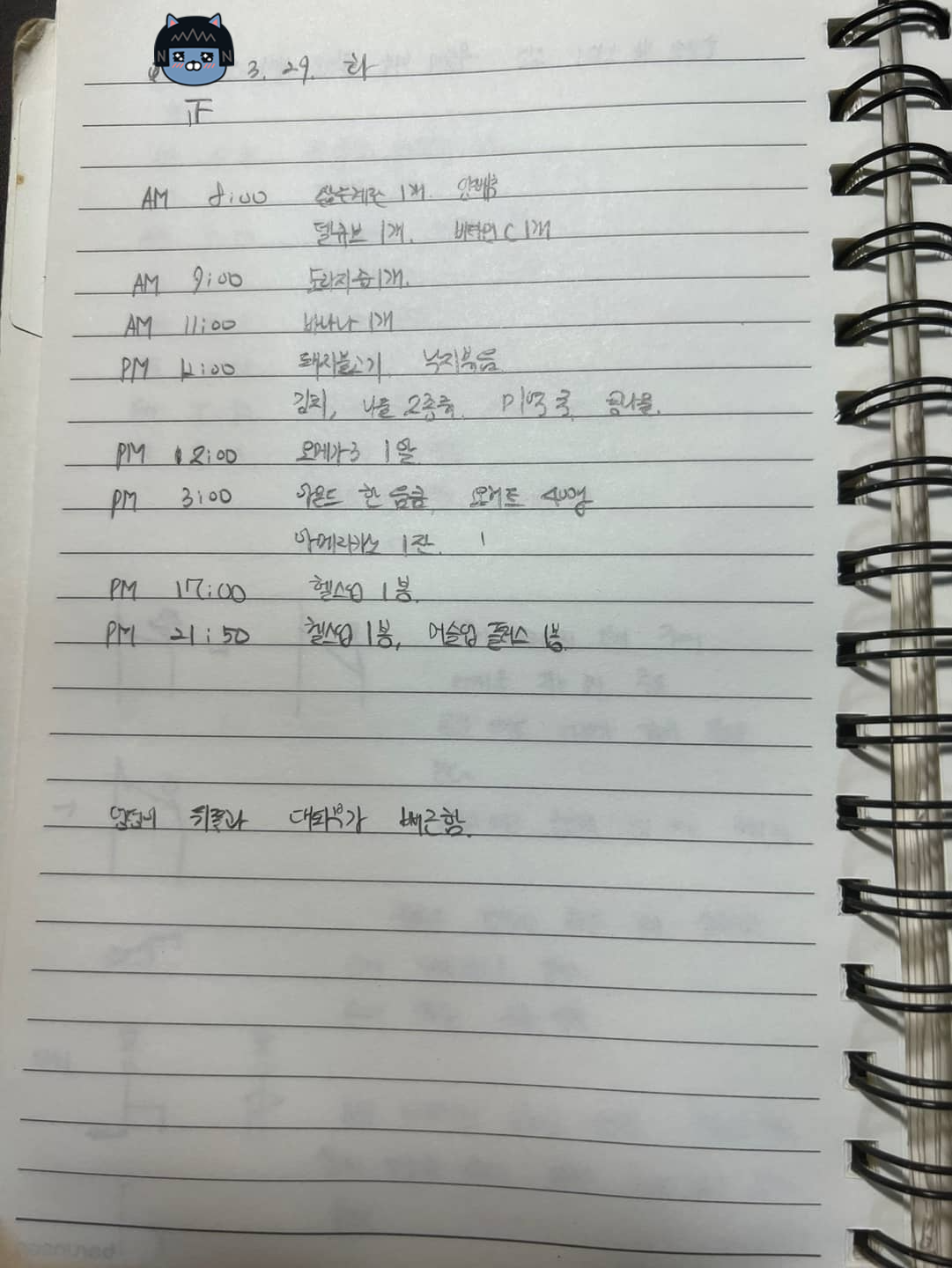 오전 7시 40분 : 헬스업 1봉지, 삶은 계란 1개, 양배추, 오메가3 1알, 비타민 1알, 도라지즙, 두부 반모