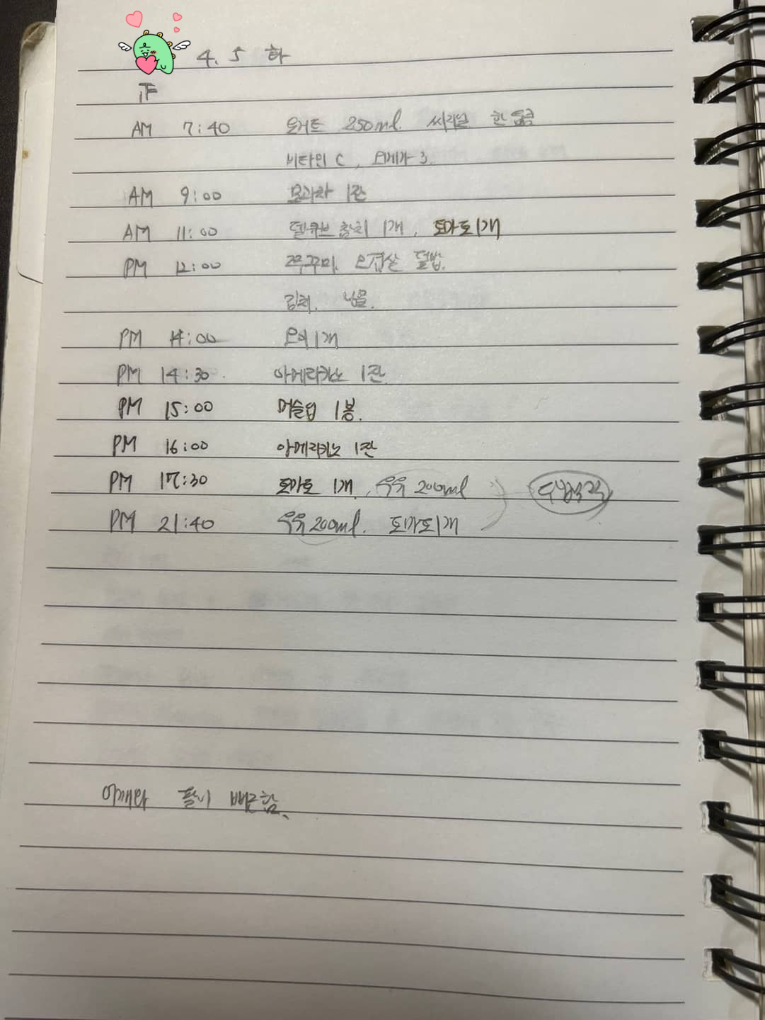 오후 3시 이후에는 단백질을 섭취한 경우가 없었습니다. 오후 5시 30분과 오후 9시 40분에 단백질 위주의 식단이 있었으면 더 좋았을 거라는 설명을 해주셨습니다.