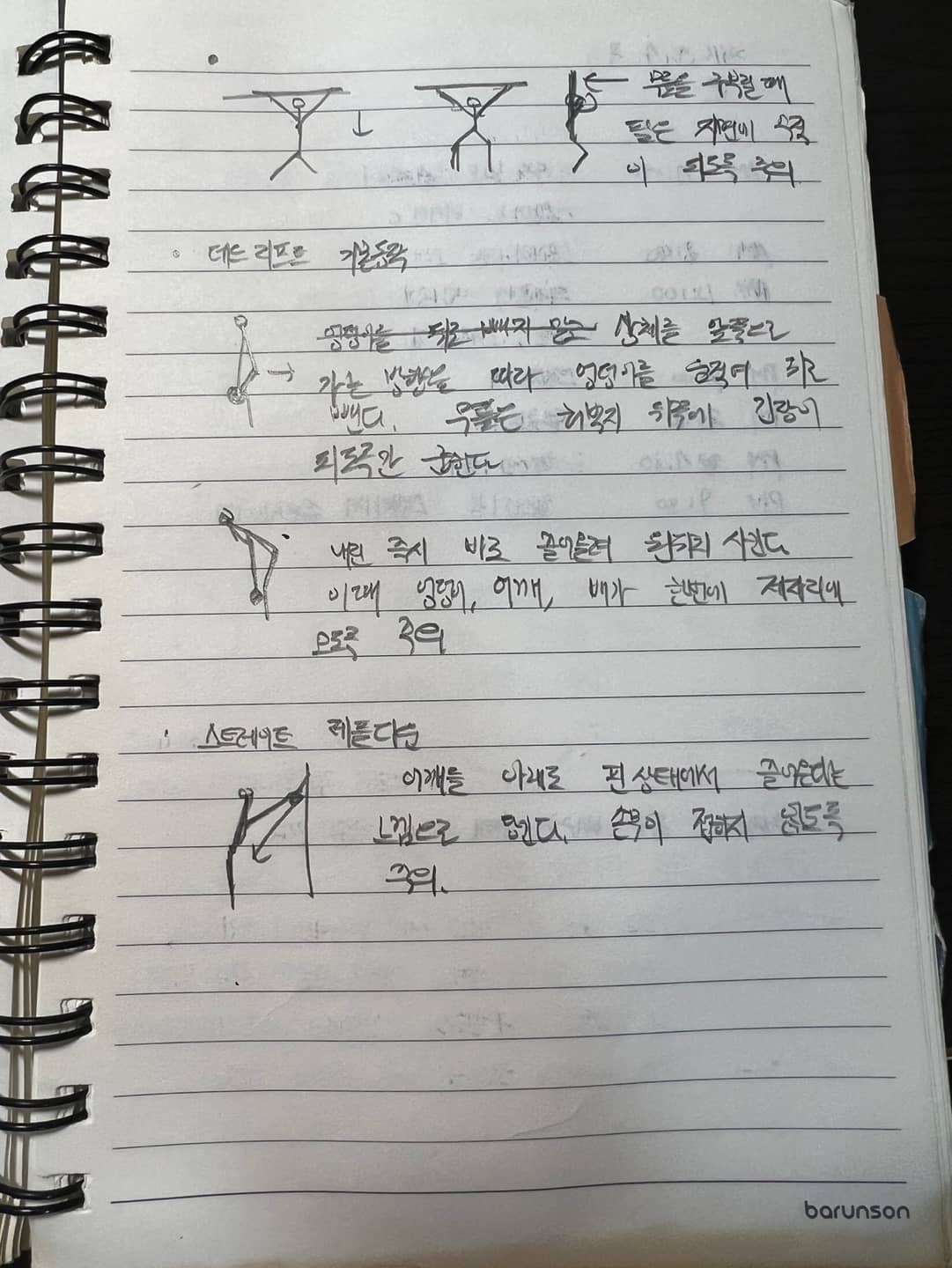 데드리프트 동작을 복습하였습니다. 중요한 동작이니 만큼 매일 연습을 통해 자세가 나올 때까지 반복 연습하는 것이 중요합니다. 20회를 1세트로 총 5세트 진행하였습니다.