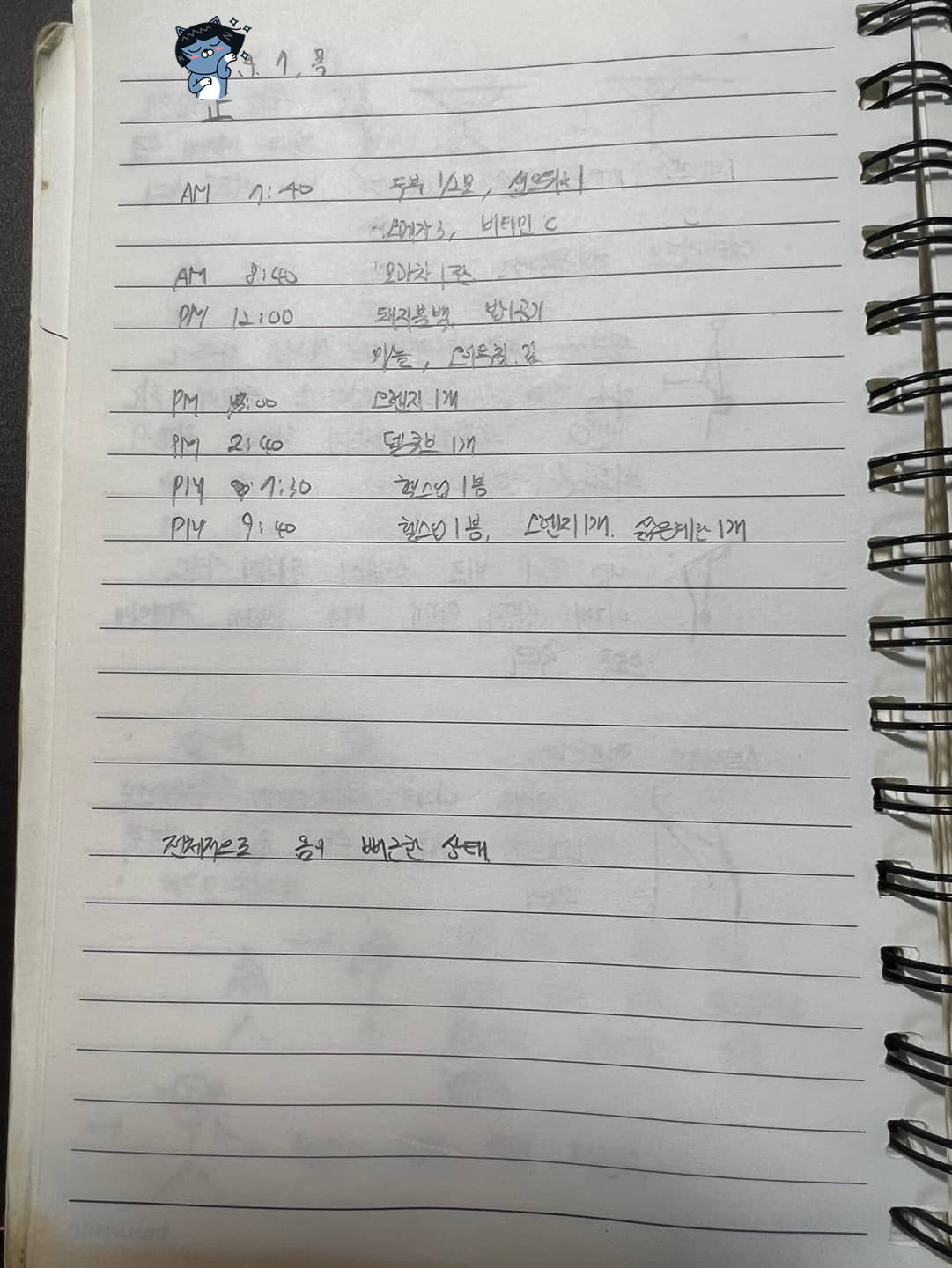 오전 7시 50분 : 두부 반모, 삶은 계란 1개, 청포도 1/2송이, 오메가 3 1알, 비타민 1알