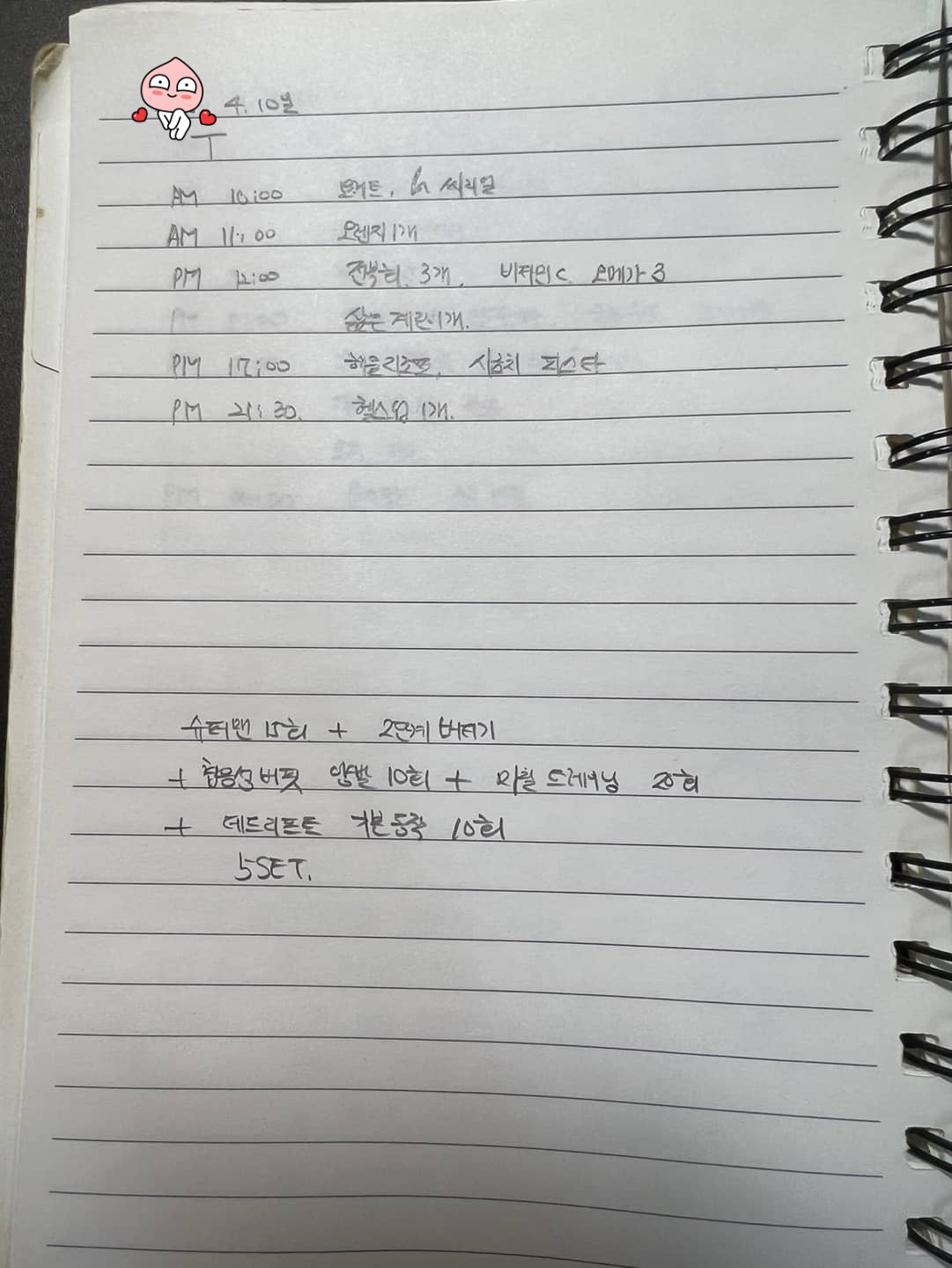 슈퍼맨 스트레칭 (마지막 회수는 10초 버티기) + 양발 버피 테스트 10회 + 마찰 트레이닝 20회 + 데드리프트 기본자세 10회를 1세트로 총 5세트 진행.