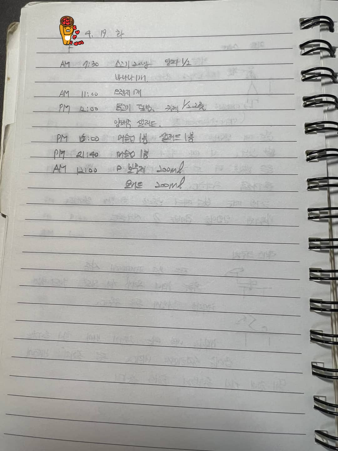 오전 12시 : 단백질 보충제 1 스쿱, 450㎖ 요구르트 반 통