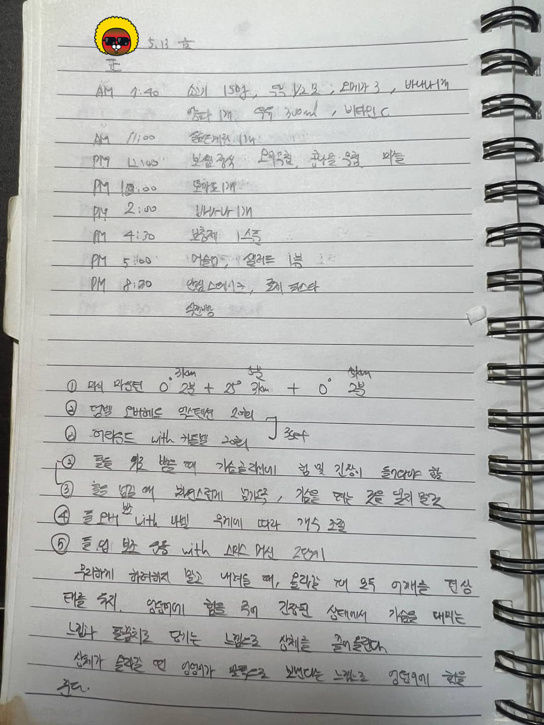 오전 7시 40분 : 소고기 150g, 두부 반모, 오메가 3 1알, 바나나 1개, 양파 1개, 우유 1잔, 비타민 1