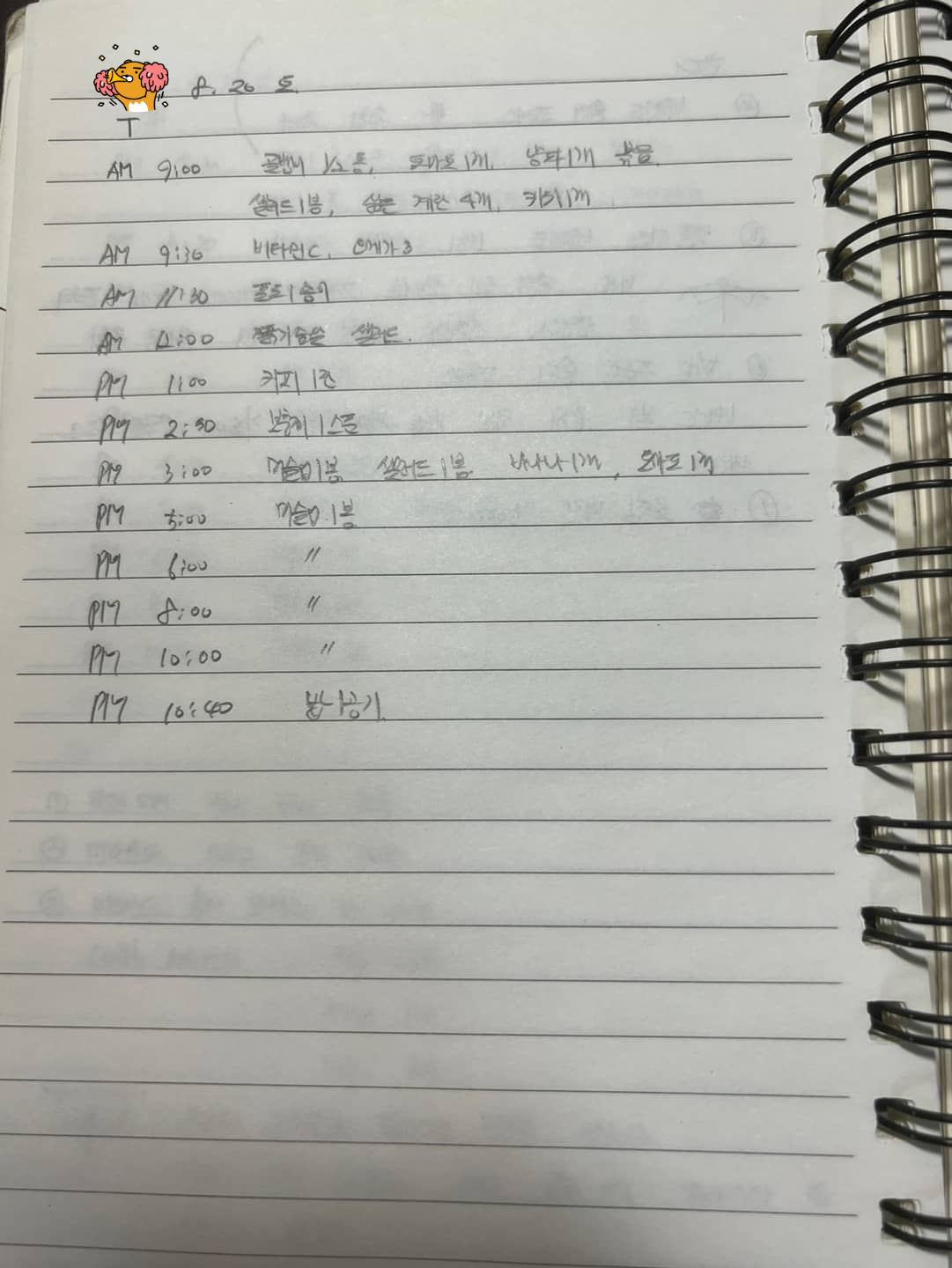 오전 9시 : 캔 골뱅이 200g, 토마토 1개, 양파 1개, 샐러드 1 봉지, 삶은 계란 4개, 키위 1개