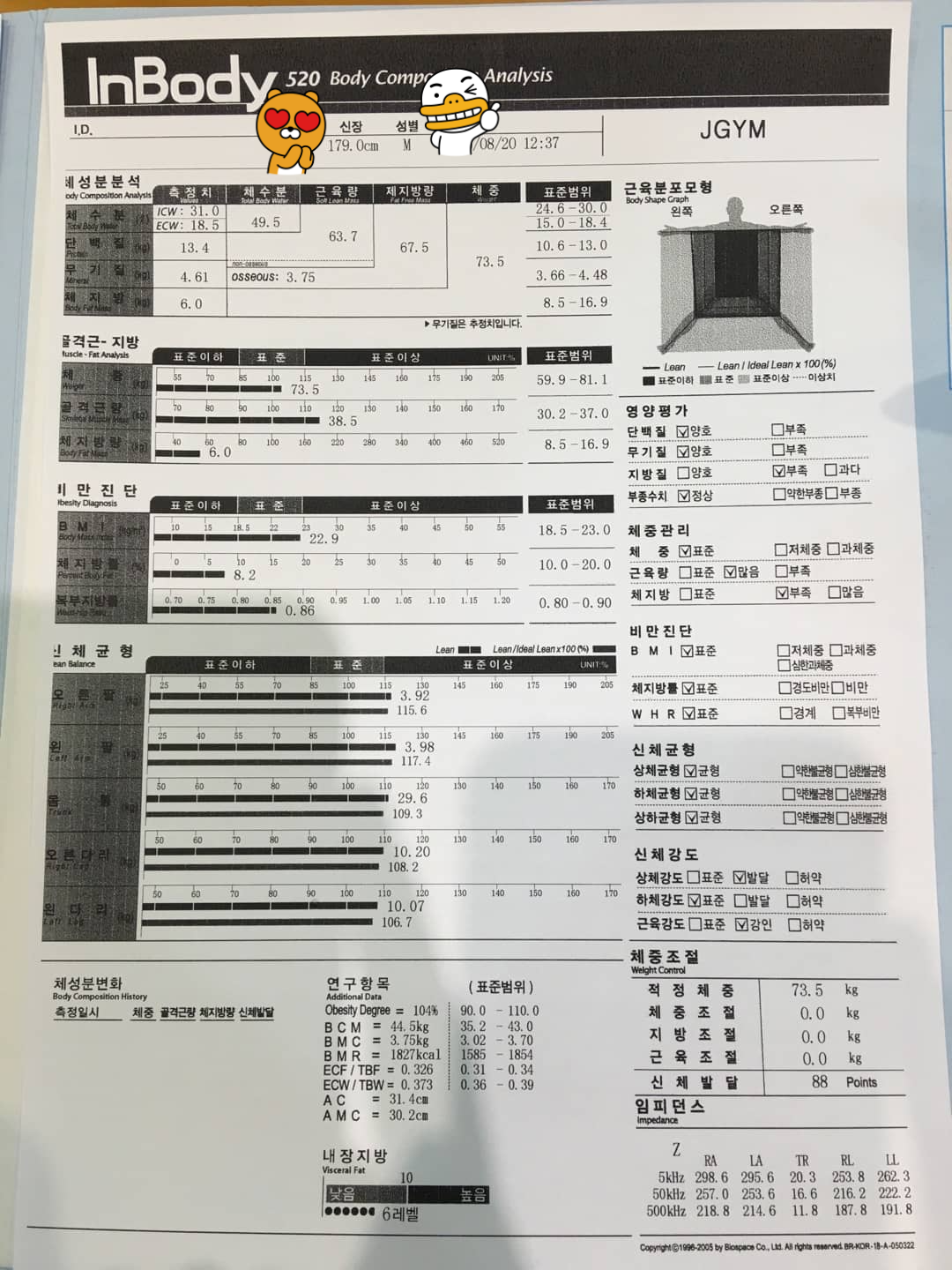 | 신체균형 (㎏) | 오른팔 : 3.98 왼팔 : 4.05 몸통 : 29.8 오른다리 : 10.36 왼다리 : 10.25 |